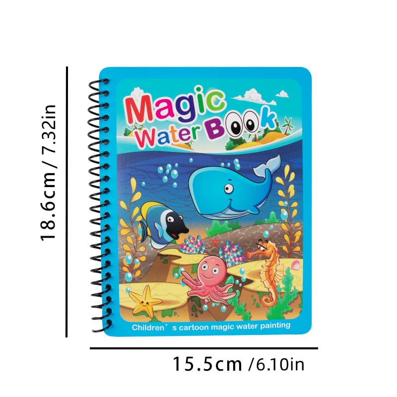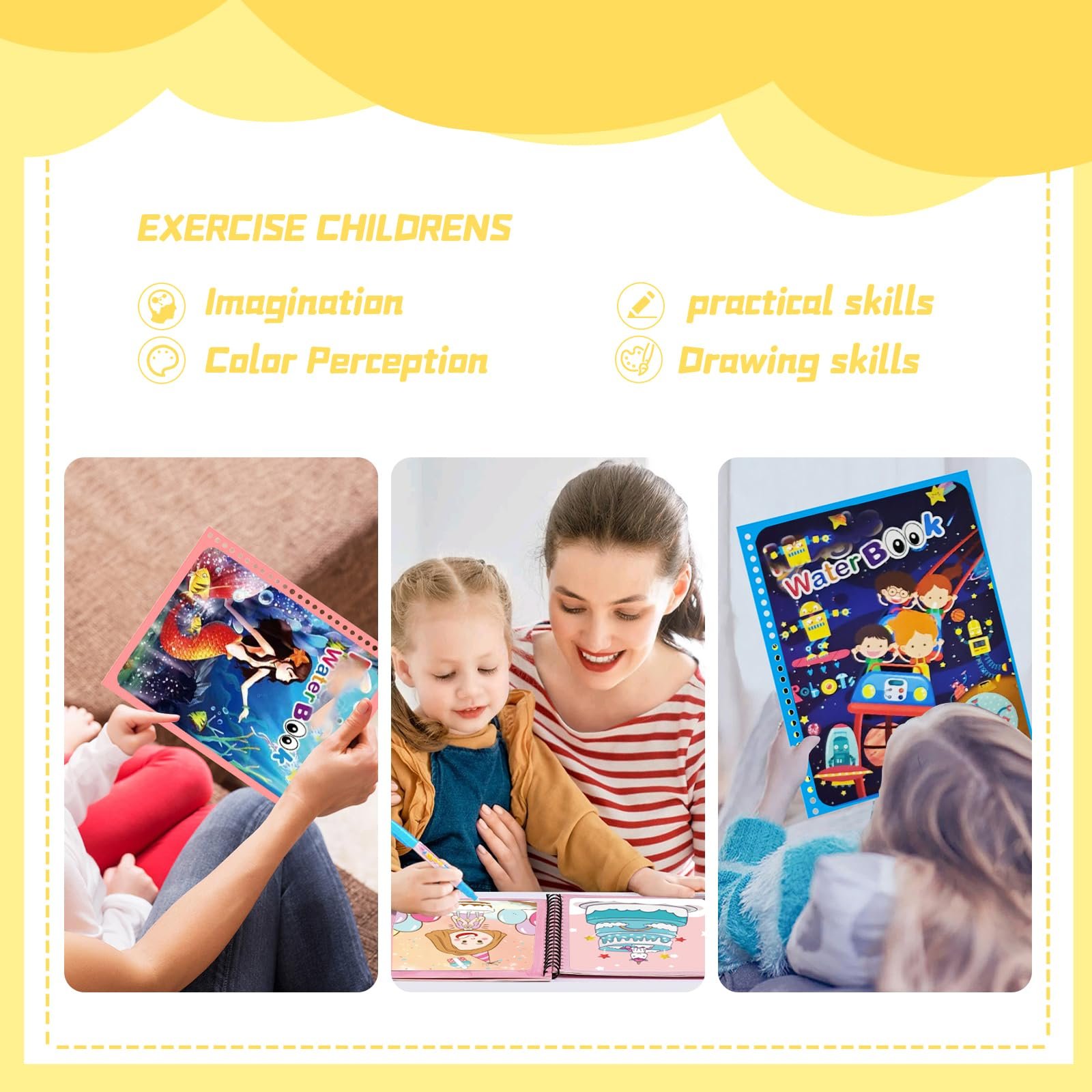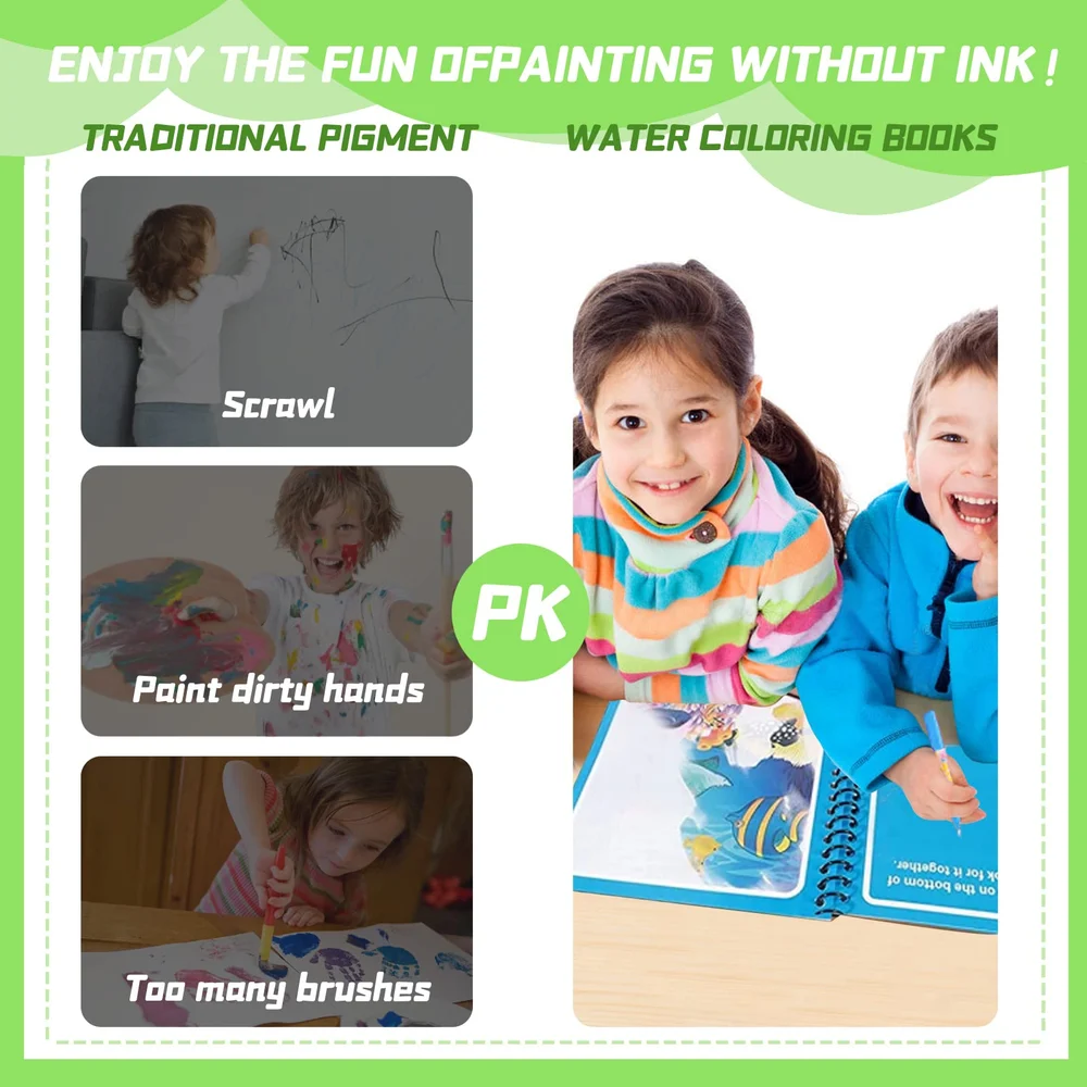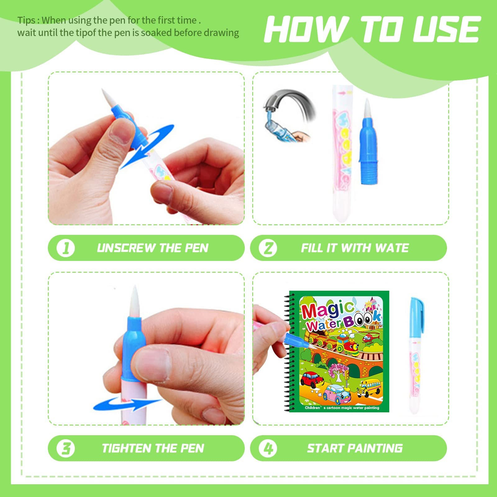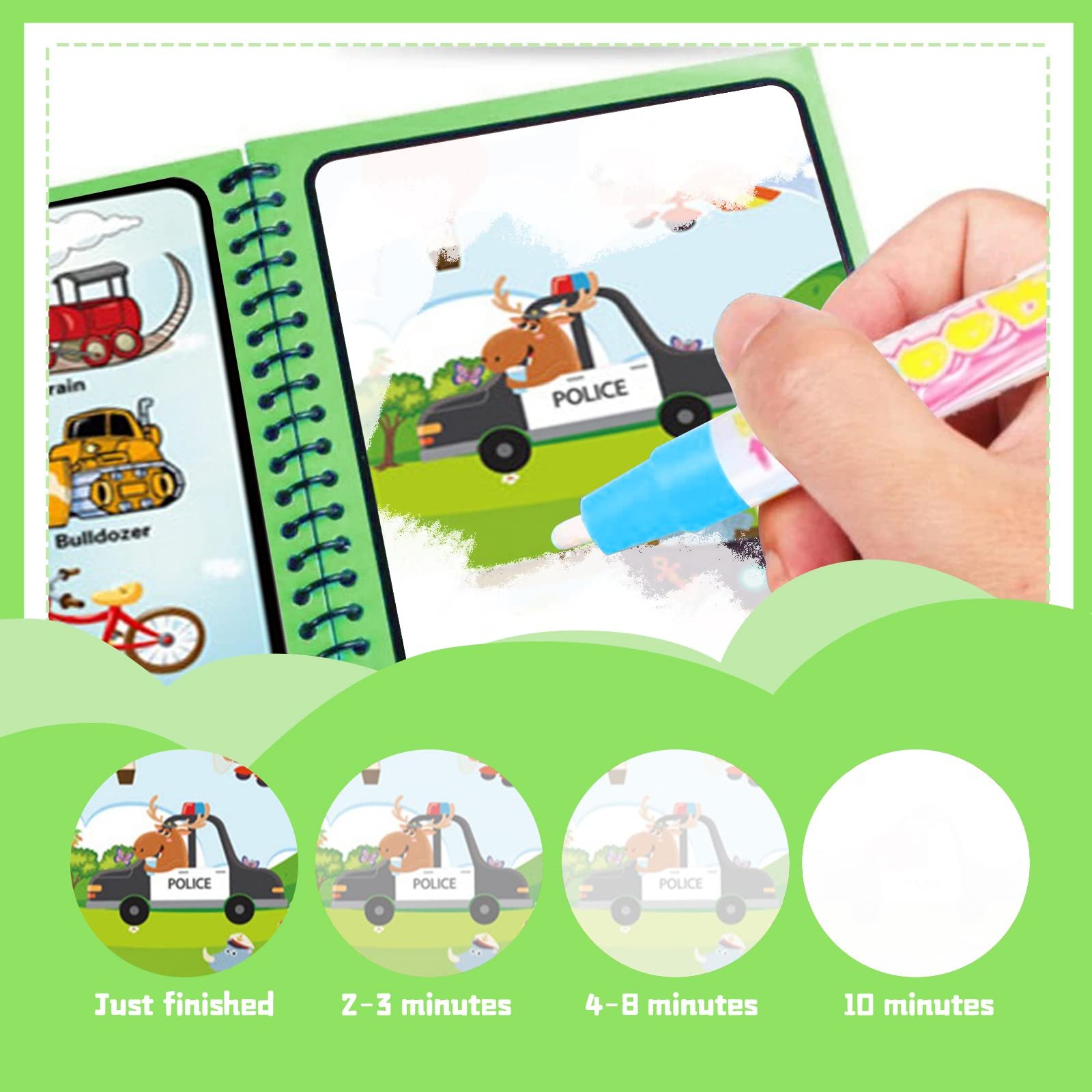 Újrafelhasználható oldalak: A vízzel rajzolt könyv lapjai újra és újra felhasználhatók. Csak várjon néhány percet, amíg az oldalak megszáradnak, és a színek elhalványulnak, így a kisgyermekek újra kezdhetik. Ezáltal fenntartható festék vízkönyvekkel.